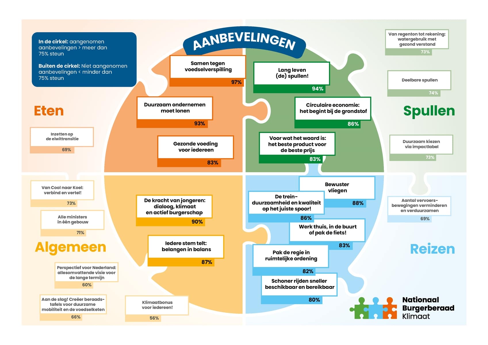 De adviezen gaan over een aantal belangrijke hoofdthema’s: voeding, spullen en vervoer. Daarnaast kwam de dwarsdoorsnede van de Nederlandse bevolking, over allerlei bubbels heen, met een aantal algemene adviezen en aanbevelingen. Bijzonder is dat het Burgerberaad ooit gelanceerd werd door Rob Jetten. Toen als minister van Economische Zaken en Klimaat, wellicht binnen afzienbare tijd als minister-president van dit land. Tal van onderwerpen zijn benoemd als kansrijk. Zoals voorstellen om voedselverspilling tegen te gaan en verder te werken aan gezonde voeding voor iedereen.