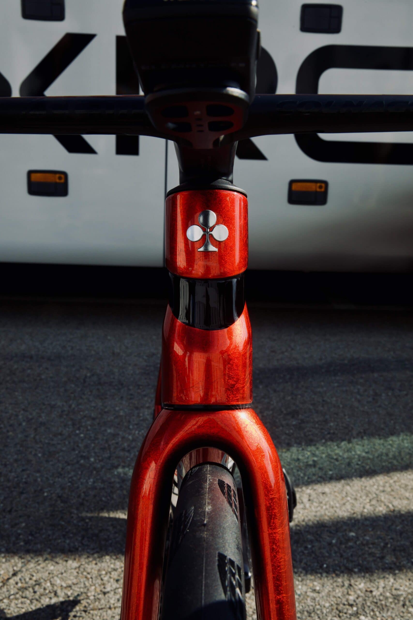 Componenten zijn op maat gemaakt: Prologo levert een speciaal zadel, Enve en Carbon-Ti zorgen voor wielen en details, CeramicSpeed voor de soepelste lagers. Uiteraard rijdt de fiets met Shimano Dura-Ace Di2 en Pirelli’s P ZERO RACE TLR 28mm.