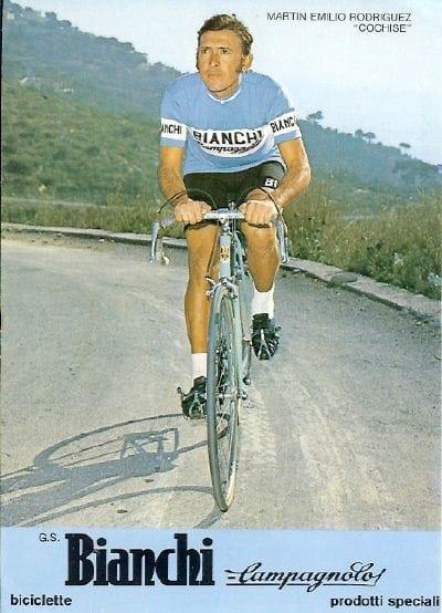 Die heeft de renner betrapt op iets onoorbaars. Een foto was er het ondubbelzinnige bewijs van geweest. Tempobeul Rodríguez had vier jaar eerder, bij wijze van vriendendienst, de Deen Ole Ritter geholpen bij diens poging het werelduurrecord voor profs aan te vallen. Samen hadden de twee vele trainingsuren en -rondjes op de wielerbaan van Mexico Stad gemaakt. Dat was op zich tot daar aan toe, ware het niet dat Rodríguez dat deed in een shirt van fietsmerk Benotto. Geheel te goeder trouw had hij het tenue van Ritter aangenomen, onwetend wat hem te wachten stond. De foto belandde bij de Colombiaanse wielerbond en die oordeelde spijkerhard dat de renner het koerstruitje zou hebben gedragen om Benotto te promoten. En als je dat doet ben je dus geen amateur maar prof, redeneerden de bobo’s. Een dikke streep ging er door de Olympische deelname van Rodríguez. Beroepsrenners zijn in 1972, als gezegd, nog lang niet welkom op de Spelen. Van lieverlee doet de Colombiaan iets waar hij niet lang daarvoor nog nooit over had nagedacht. Hij waagt de overstap naar Europa en tekent een profcontract. Cochise draait een half jaartje mee in de Italiaanse Salvarani-ploeg, waar Felice Gimondi de kopman is. Zes maanden later neemt Bianchi het hoofdsponsorschap over en sluit trouwens ook werelduurrecordhouder Ritter zich bij de selectie aan. Drie seizoenen koerst Rodríguez in de kenmerkende lichtblauwe tricots van het legendarische Italiaanse fietsmerk. Even zoveel keer rijdt hij de Giro. Bij zijn debuut in 1973 wint hij een etappe en twee jaar later nog een. Aan de zijde van Gimondi zegeviert hij bovendien in koppeltijdrit Trofeo Baracchi en debuteert hij in zijn slotjaar als prof in Europa in de Tour. Als allereerste Colombiaan ooit rijdt hij de Franse ronde. In de rol van meesterknecht staat de dan al 33-jarige Rodríguez in Parijs op een 27ste plaats in de eindrangschikking. Het blijft bij dat ene Touroptreden. Alhoewel, als een klein decennium later de eerste volwaardige Colombiaanse ploeg haar opwachting maakt in Frankrijk, zit er een bekend gezicht achter het stuur van een van de volgwagens. Het is Martín Rodríguez. Al heeft hij zelf veel liever dat je hem aanspreekt met de naam van zijn grote held. Het negentiende-eeuwse opperhoofd van de Apache-indianen. Cochise.