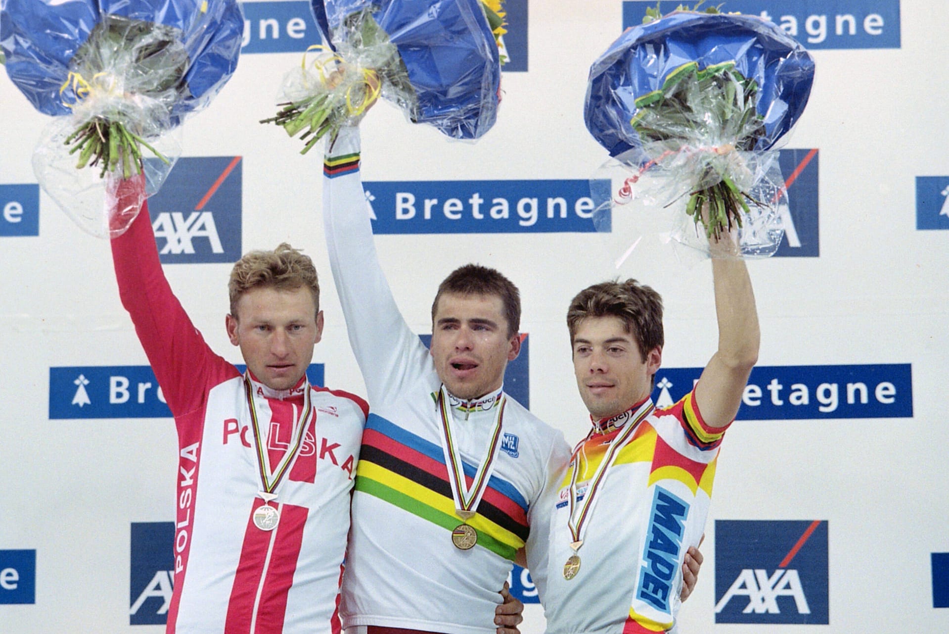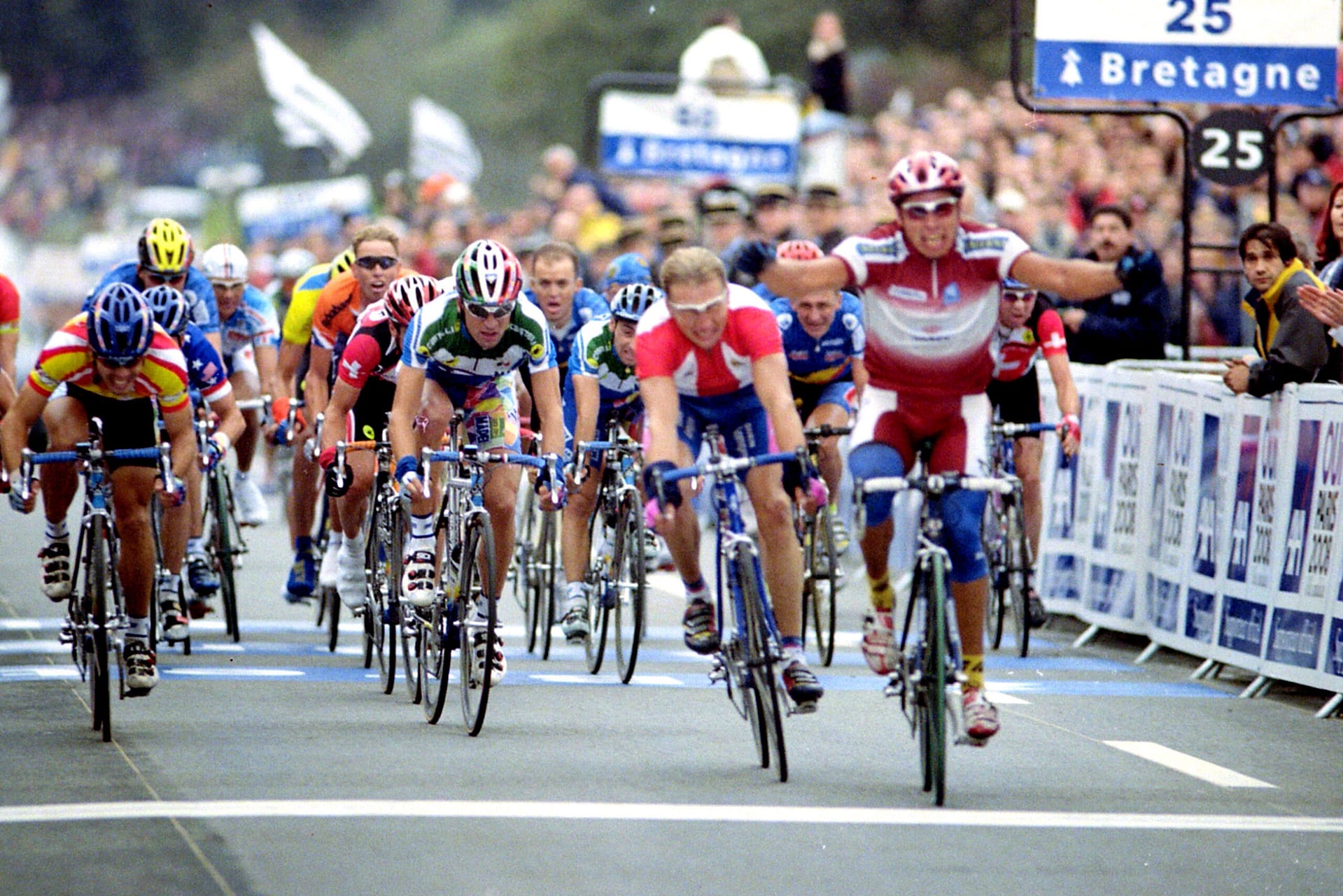 Bijna letterlijk is de hete adem van de achtervolgende groep nu voelbaar. Negentig. Waar blijft die finishlijn? Tachtig. Zeventig, nog maar. Ineens stormen ze voorbij. Eén, twee, drie renners denderen over de koploper heen. En nog een stuk of vijf. Tien zelfs. Moegestreden bolt de dappere aanvaller over de finish, in de buik van de groep die hem zo-even nog op de hielen zat. Niets regenboogtrui. Een troosteloze, anonieme negentiende plaats; meer levert het WK van 2000 niet op voor de man die een handvol seconden eerder in kansrijke positie verkeerde. Terwijl Andrei Tchmil de teleurstelling verbijt, wordt een paar meter verderop een wereldtitel gevierd. Eigenlijk kan het de tot Belg genaturaliseerde Moldaviër weinig schelen wie zich de nieuwe drager van de regenboogtrui mag noemen, maar hij kan het toch niet laten een blik op het scorebord boven de finish te werpen. Niet hijzelf, maar een ander die ooit een paspoort van de Sovjet-Unie bezat, wint. ‘Champion du Monde: Romāns Vainšteins’, luidt het verdict van Plouay.