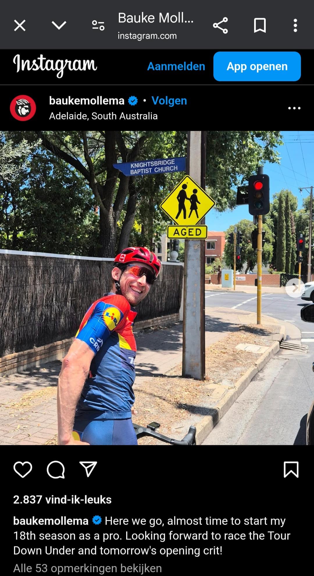 Doodjammer dat de Eurosport player (full coverage from finish to start was toch hun slogan?) de nek is omgedraaid door het Discovery-HBO Max-kartel, anders hadden wij – koershunkeraars – daar heus wel onze nachtrust (want Australië) aan opgeofferd. Overdag zendt Eurosport een samenvattinkje uit van de laatste 52 km. Nou ja, het is in ieder geval iets en wonderful om de renners onder de blikkerende zon over de stoffige wegen te zien sjezen. Sowieso de zon zien is al geweldig. Enne… loopt daar een kookaburra? Mollema heeft iets met vogels die hem aanvallen.