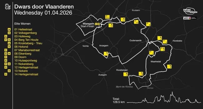 De vrouwen starten in Waregem en krijgen met de Hellestraat één nieuwe helling op hun parcours. De finale is identiek aan die van de mannen: dezelfde dubbele passage over Nokereberg en Herlegemstraat, dezelfde aankomst op de Verbindingsweg. Met 128,9 kilometer, 8 hellingen en 6 kasseisectoren is de koers lang genoeg om het veld grondig te schiften, zonder het karakter te verliezen dat Dwars door Vlaanderen bij de vrouwen de voorbije jaren heeft opgebouwd.