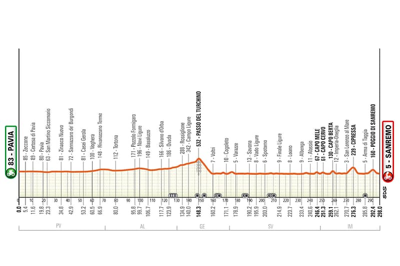 De mannenkoers is door een lus ten noorden van Certosa en nieuw asfalt via Sannazzaro de’ Burgondi en Casei Gerola zo’n negen kilometer langer dan in 2025. Na Voghera en Tortona sluit het peloton aan op de bekende route richting de Ligurische kust. Het totale hoogteverschil bedraagt 2.388 meter, verdeeld over de Passo del Turchino (5,6 km aan 2,9%), de drie Capi langs de kust, de Cipressa (5,6 km aan 4,1%) en de Poggio di Sanremo (3,7 km aan 3,7%, met een stuk van 8% nabij de top). Maar uiteraard draait alles om die laatste twee: de Cipress en de Poggio.