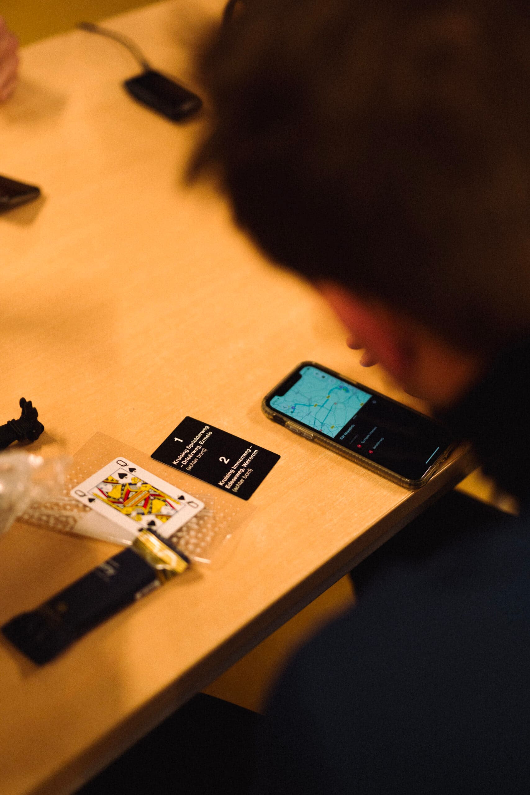 Daarbij krijg je bij elke ronde een opdrachtkaart. Hier staan vaak twee kruisingen op. Dus bijvoorbeeld: Kruising Dorpsstraat en Kerkstraat in Apeldoorn. Daar moet je heen, om je tweede en derde speelkaart op te halen en weer terug te brengen voor je volgende opdracht.
