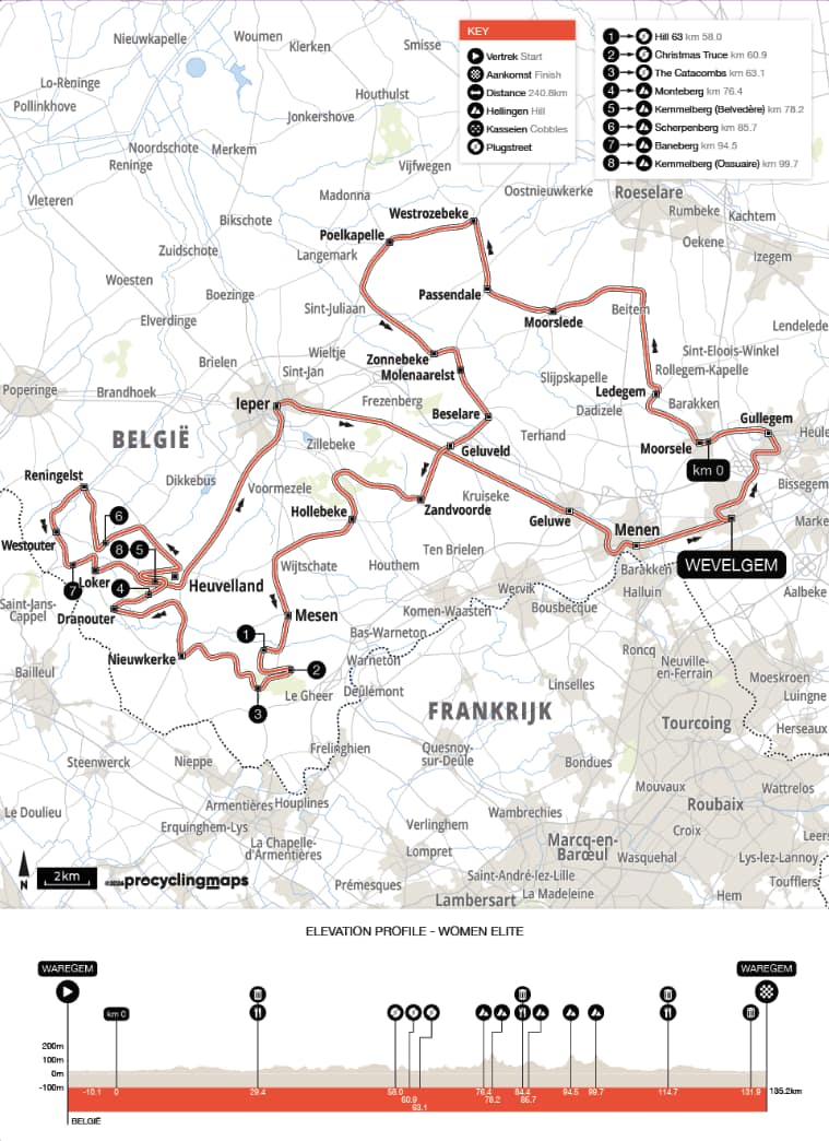 De vrouwenwedstrijd start en finisht in Wevelgem over een parcours van circa 135 kilometer. Van Den Spiegel wees op de UCI-limiet voor maximale wedstrijdafstand als reden waarom een kuststart voor de vrouwen niet haalbaar is. De vrouwenkoers behoudt wel de Plugstreets, de Kemmelberg en het Heuvelland als selectiemomenten.