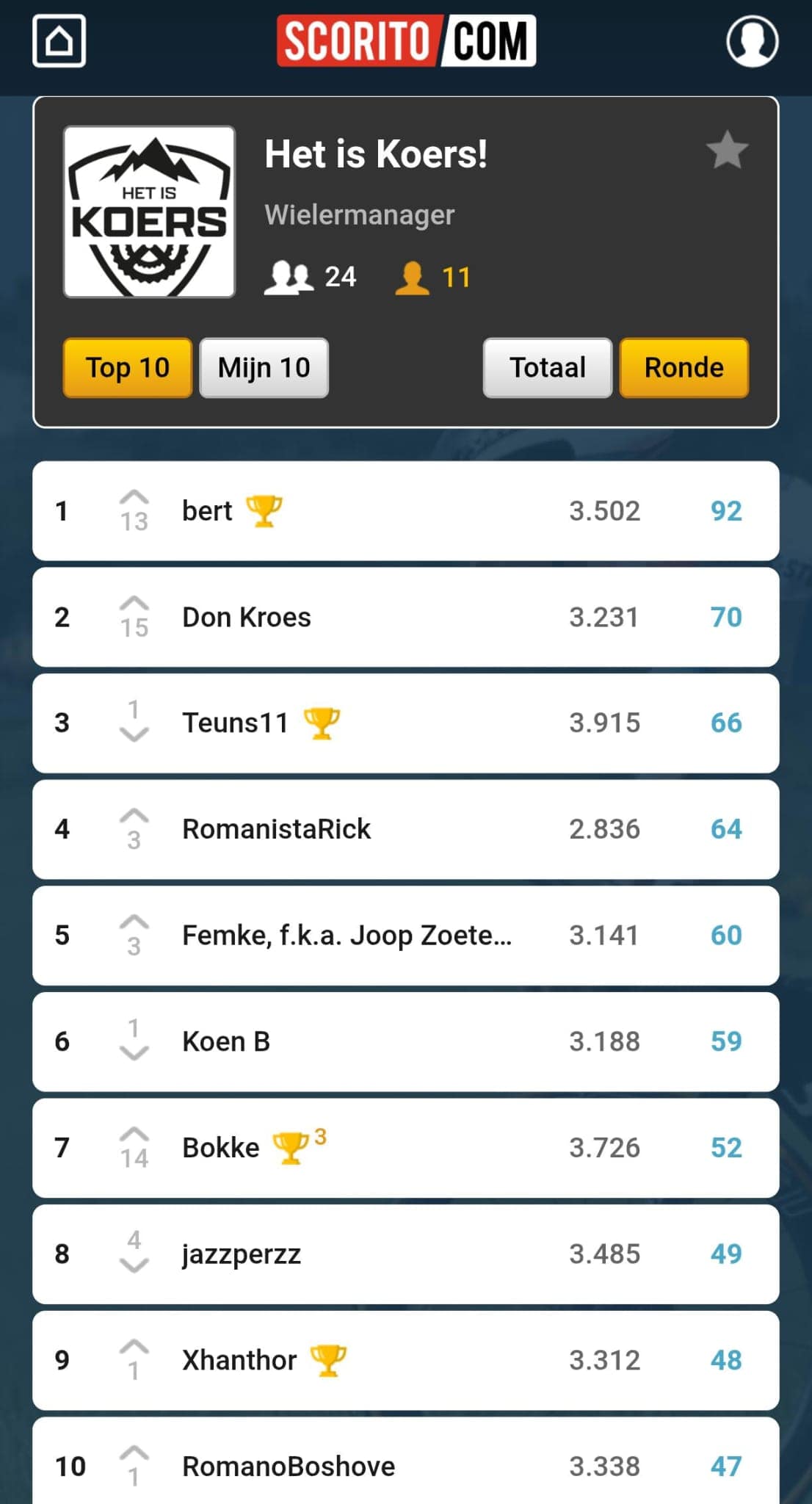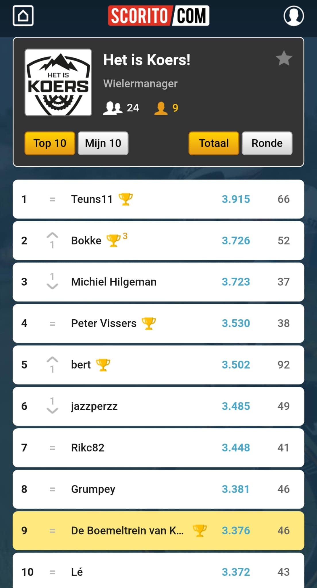 Tussenetappes waarin uiteindelijk de vluchters bijna alle etappepunten opeisen zijn de moeilijkste te voorspellen. Heb je – toevallig – de winnaar goed of eindigt je kopman bij de voorste dan kan het een mooie dag worden, maar meestal is het een kwestie van bijeen schrapen van punten. Zo ook vandaag, waar bert dankzij kopman Wout van Aert, Rick Pluimers, klassementsleider Isaac del Toro en nota bene de niet gefinishte Juan Ayuso een comfortabele zege boekte.