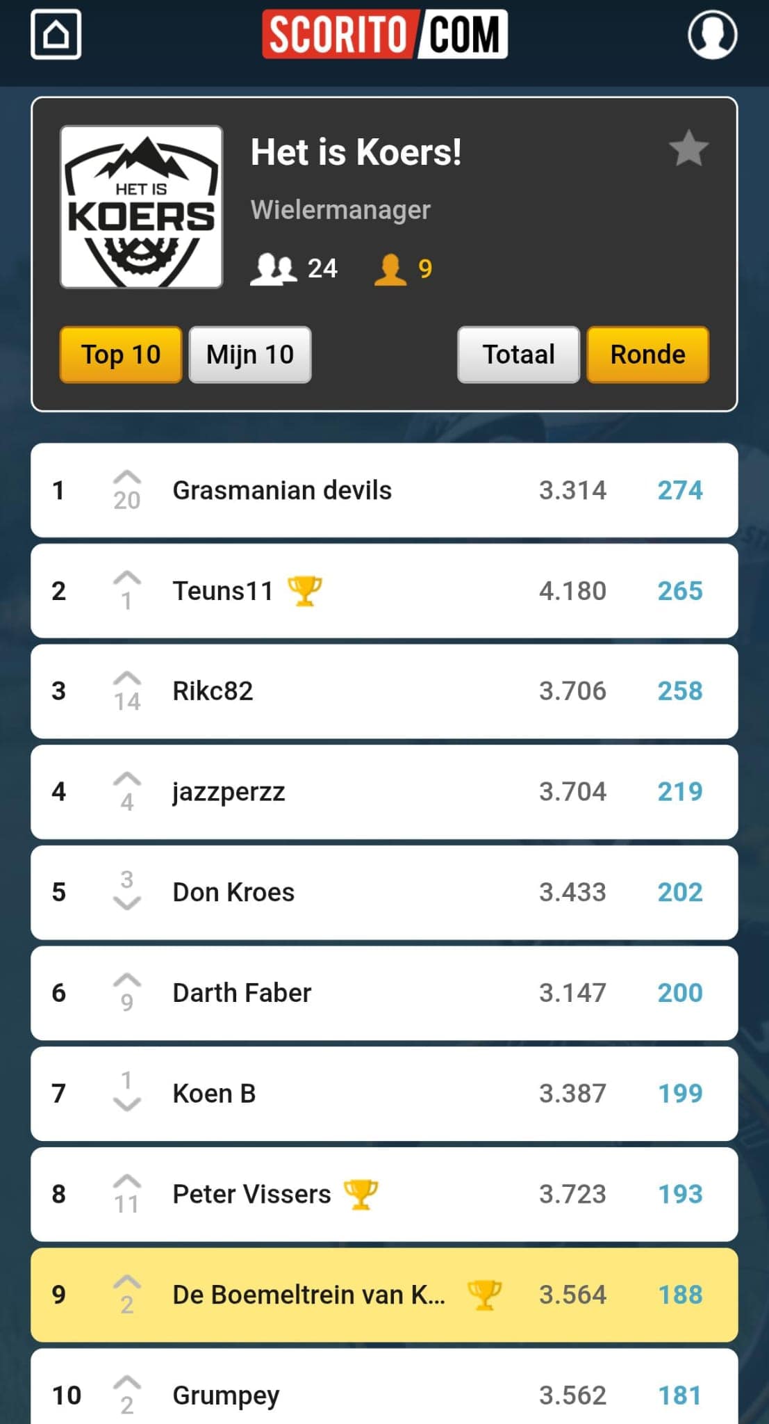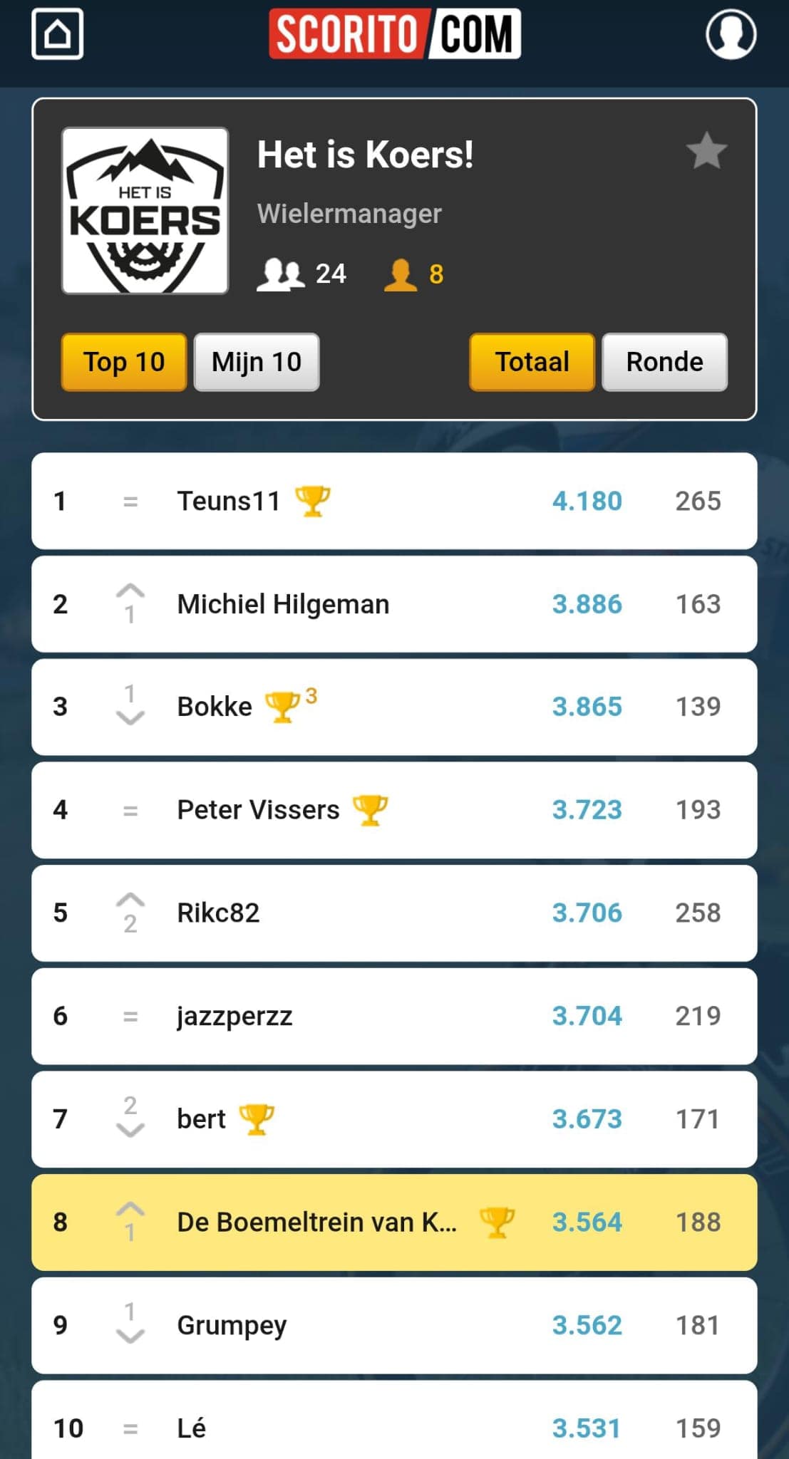 Aangezien alles nog speelbaar lijkt tussen Del Toro, Carapaz en Yates lijkt het morgen op een vergelijkbare uitslag uit te draaien, waarmee onze Giropool waarschijnlijk ook in een definitieve plooi komt te liggen. Met de punten die in de eindafrekening nog voor het grijpen liggen voor hem, hoeft Teuns de ronde alleen maar ongeschonden uit te rijden om zichzelf de winnaar te mogen noemen van deze eerste grote ronde van het jaar.