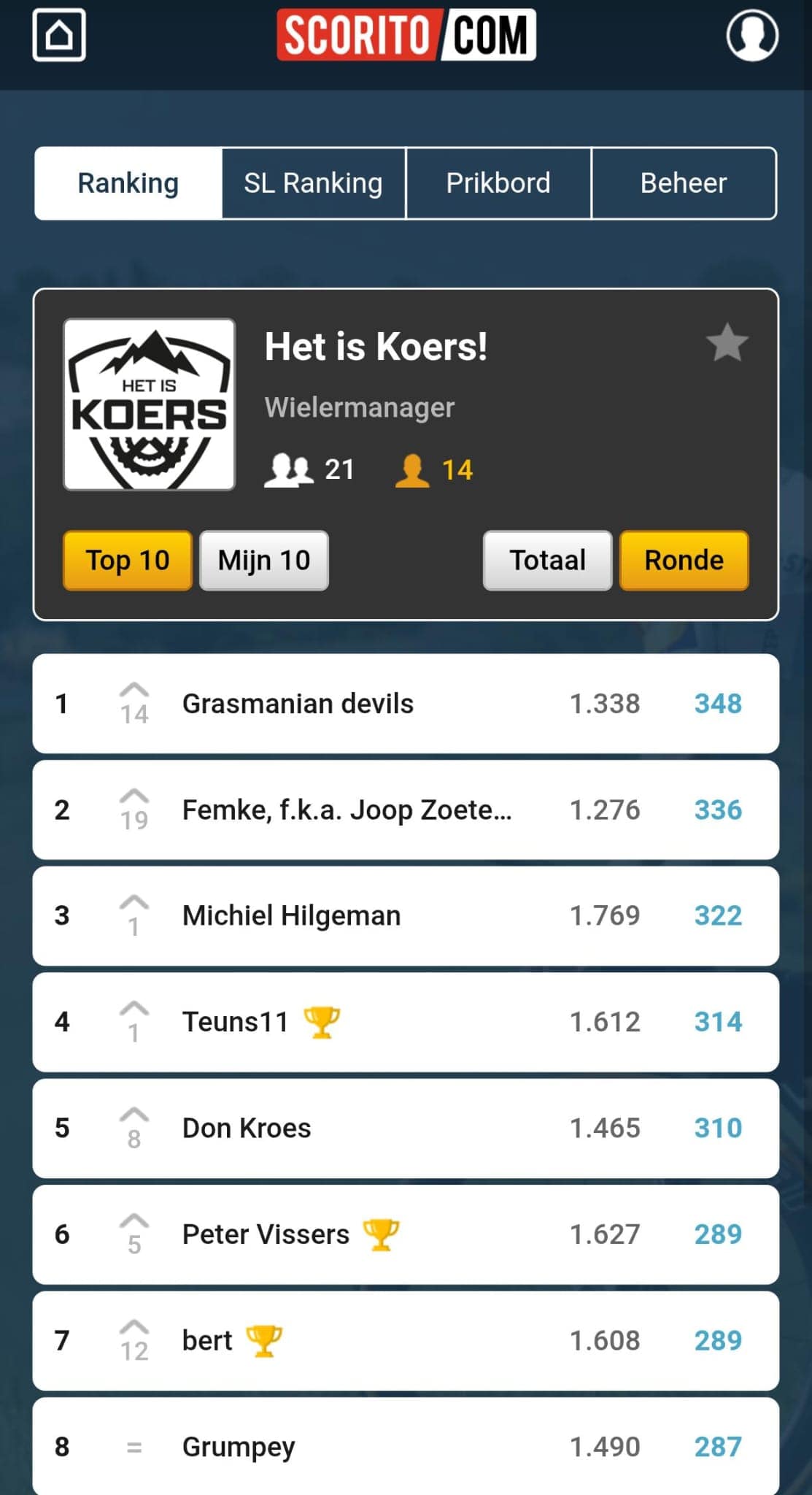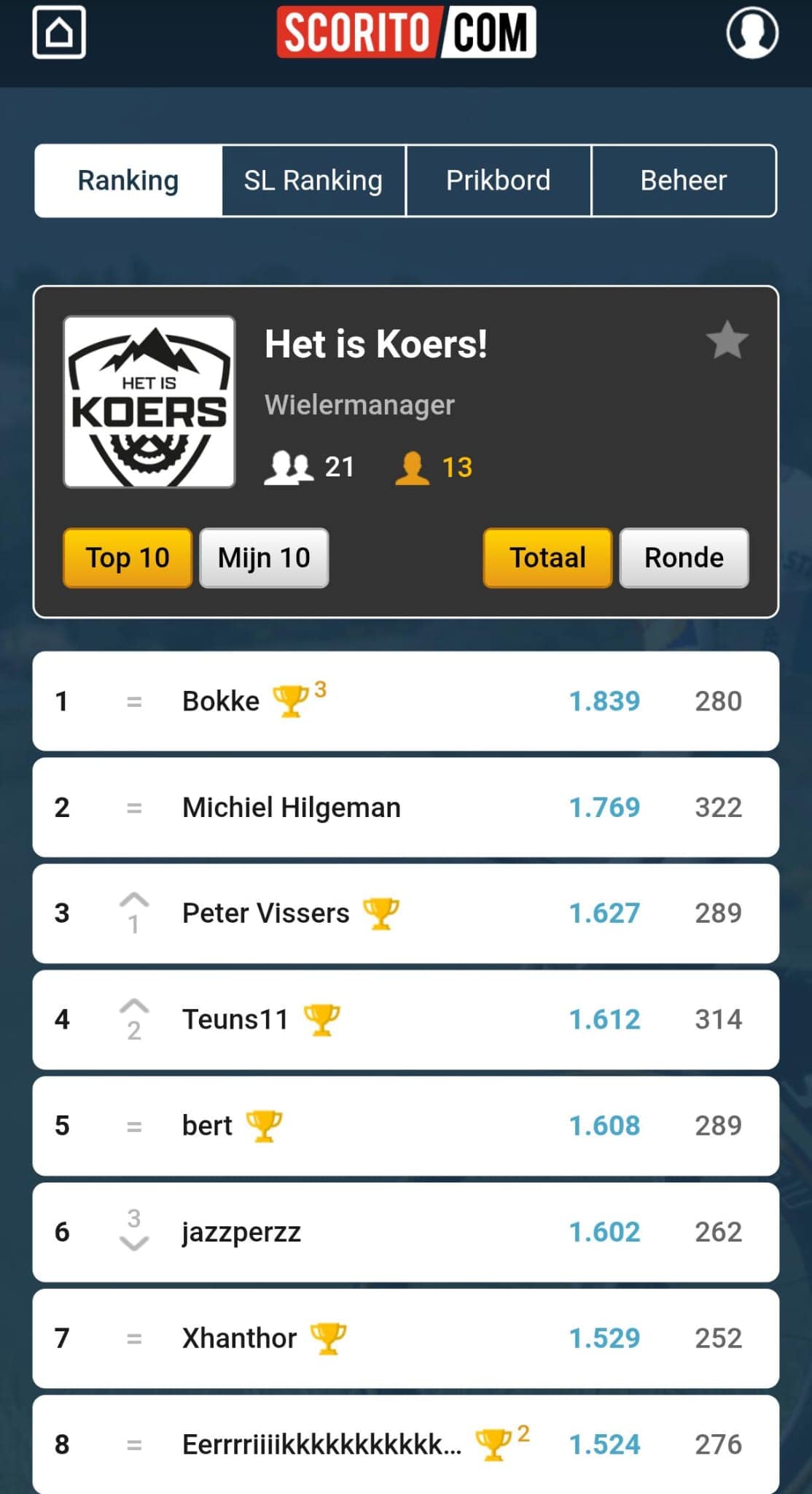 In de top van het klassement kwam Michiel Hilgeman het beste voor de dag. De huidige nummer twee werd achter Grasmanian Devilz en Femke, f.k.a. Joop Zoetemelk keurig derde in de etappe en nam en passant een flinke hap uit zijn achterstand op Bokke, die nog wel onze leider blijft.
