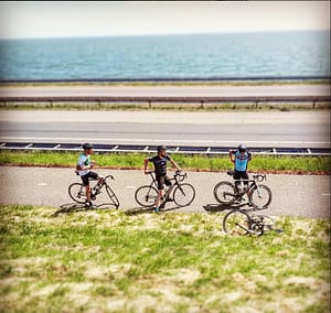We denken er klaar voor te zijn en beginnen onze magische tocht om het IJsselmeer. Het startschot klinkt en we klikken in. Er zijn drie stops. Op 70 kilometer staat de volgwagen om de bidons bij te vullen in Urk. Op 135 gaan we onze maagjes vullen met een pannenkoek in Makkum. De laatste stop doen we in Abbekerk op zo’n 70 kilometer van de finish in Muiden. Ook in Abbekerk hebben we gelegenheid om bidons te vullen en reepjes in de achterzak bij te steken. Onze route zal gaan van Muiden naar Almere om zo via Lelystad door te steken naar Friesland. De richting wordt bepaald door de wind. Op deze manier hebben we wind mee op de Afsluitdijk en ook op de terugweg langs Volendam en Hoorn hebben we een zetje in de rug. Alles verloopt voorspoedig de eerste 45 kilometer. We gaan ondanks de tegenwind als een malle. Het duurt niet lang voordat er 30 gemiddeld op mijn navigatie staat.