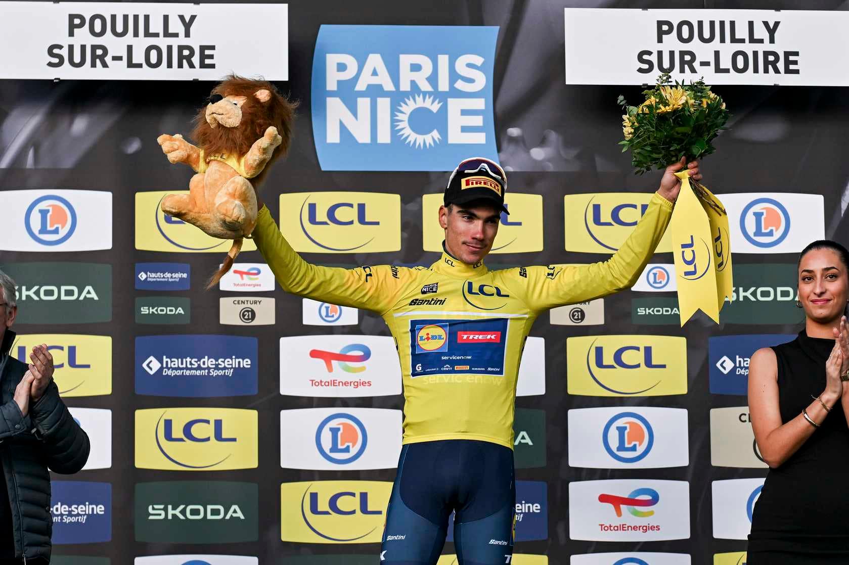 Foto A.S.O./Billy CeustersDinsdagmiddag aan de Loire, ergens tussen Cosne-Cours-sur-Loire en Pouilly-sur-Loire, sleurt Joshua Tarling zijn twee kopmannen naar de finishstreep. Ineos Grenadiers wint de 23,5 kilometer lange ploegentijdrit in de derde etappe van Parijs-Nice, hun eerste zege in de discipline sinds 2021. Maar het geel gaat niet naar de Britse formatie. Dat pakt Juan Ayuso van Lidl-Trek, dankzij vier bonificatieseconden die hij een dag eerder sprokkelde. Jonas Vingegaard, de verdedigende Tourwinnaar, verliest 17 seconden op de nieuwe leider.