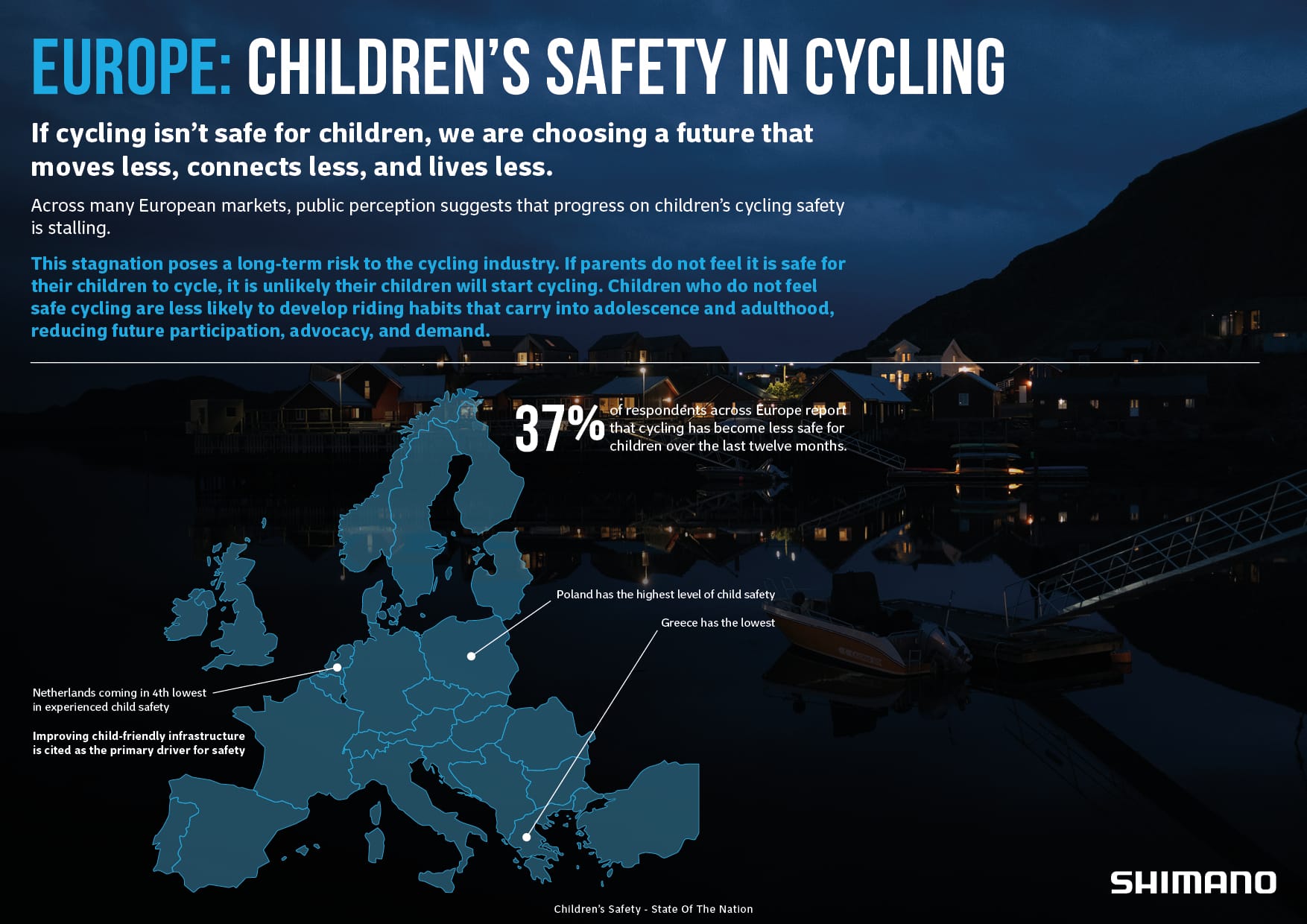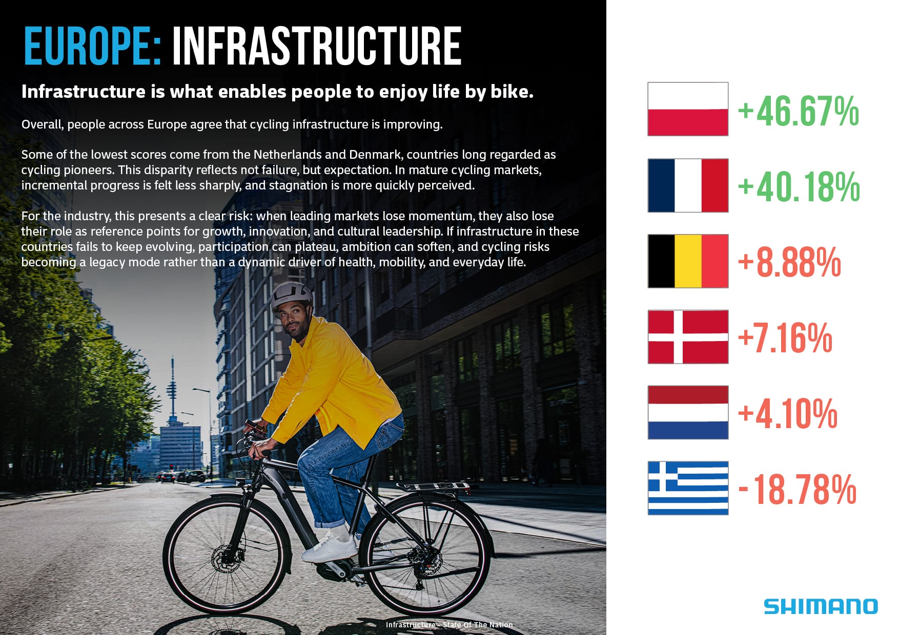 Foto ShimanoHet onderzoek is gebaseerd op een uitvraag onder 25.000 Europeanen over hoe fietsen in de dagelijkse praktijk wordt ervaren. Op één aspect is Nederland in elk geval nog altijd koploper: het percentage Nederlanders dat een fiets bezit is nog altijd ruim 91% (en het percentage dat ooit een fiets had is zelfs een bijna perfecte score van 99,7%). Tot zo ver het goede nieuws. Want waar het gaat om de vraag hoe mensen ervaren of het veiliger is geworden voor kinderen om te fietsen in hun leefomgeving schiet ons land in het rood en is er sprake van een duidelijke afname. We scoren daar zelfs als vierde laagste van Europa. Dat geldt ook daar waar gaat om ervaringen verbeteringen in de infrastructuur. Daar scoort Nederland vergelijkbaar (slecht) met Bulgarije, de Balkan en Tsjechië.