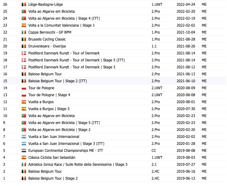 Evenepoel pakte ook 6 tijdritoverwinningen, zijn absolute specialiteit (twee daarvan in Algarve)