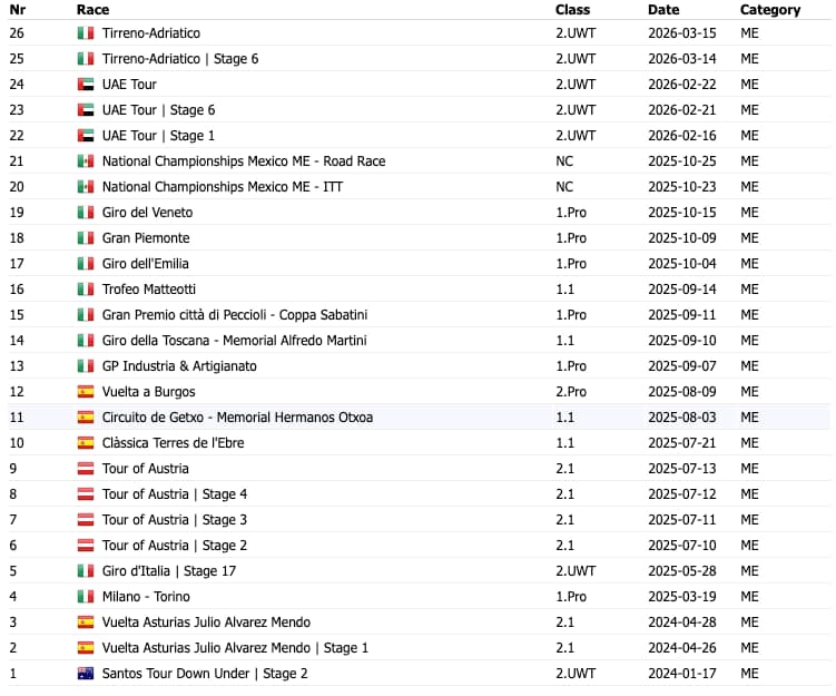 De Mexicaan stelde in San Benedetto del Tronto zijn eerste eindzege in de Tirreno-Adriatico veilig. Met zijn 26ste profzege bereikt hij exact hetzelfde aantal overwinningen als Remco Evenepoel op dezelfde leeftijd.