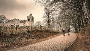 Alternatief: Haaghoek. De lange, glooiende kasseistrook die in 2026 opnieuw in het parcours zit, gevolgd door de Leberg. Je kunt hier de renners ook de Leberg op zien rijden. Minder publiek, twee passages, en je hoort de kettingen kraken. En als je een beetje opschiet kun je daarna de renners nog op de Muur zien.