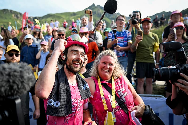 Aan de meet komen alle verhalen weer samen. Martinez die met een soort ongeloof de trui aanpakt. Healy die vooral blij is en selfies maakt. Yates die straalt (na een dagje op plek 146-147 te hebben gereden de dag ervoor) en Arensman baalt (en hijgt uit). De Franse droom van een zege op 14 juli is vakkundig de grond in geboord, maar met een nieuwe gele trui, witte trui, bolletjestrui (in Franse handen) én een etappe winnaar die je het wel gunt, kunnen de Fransen de Bastille dag toch goed afsluiten.