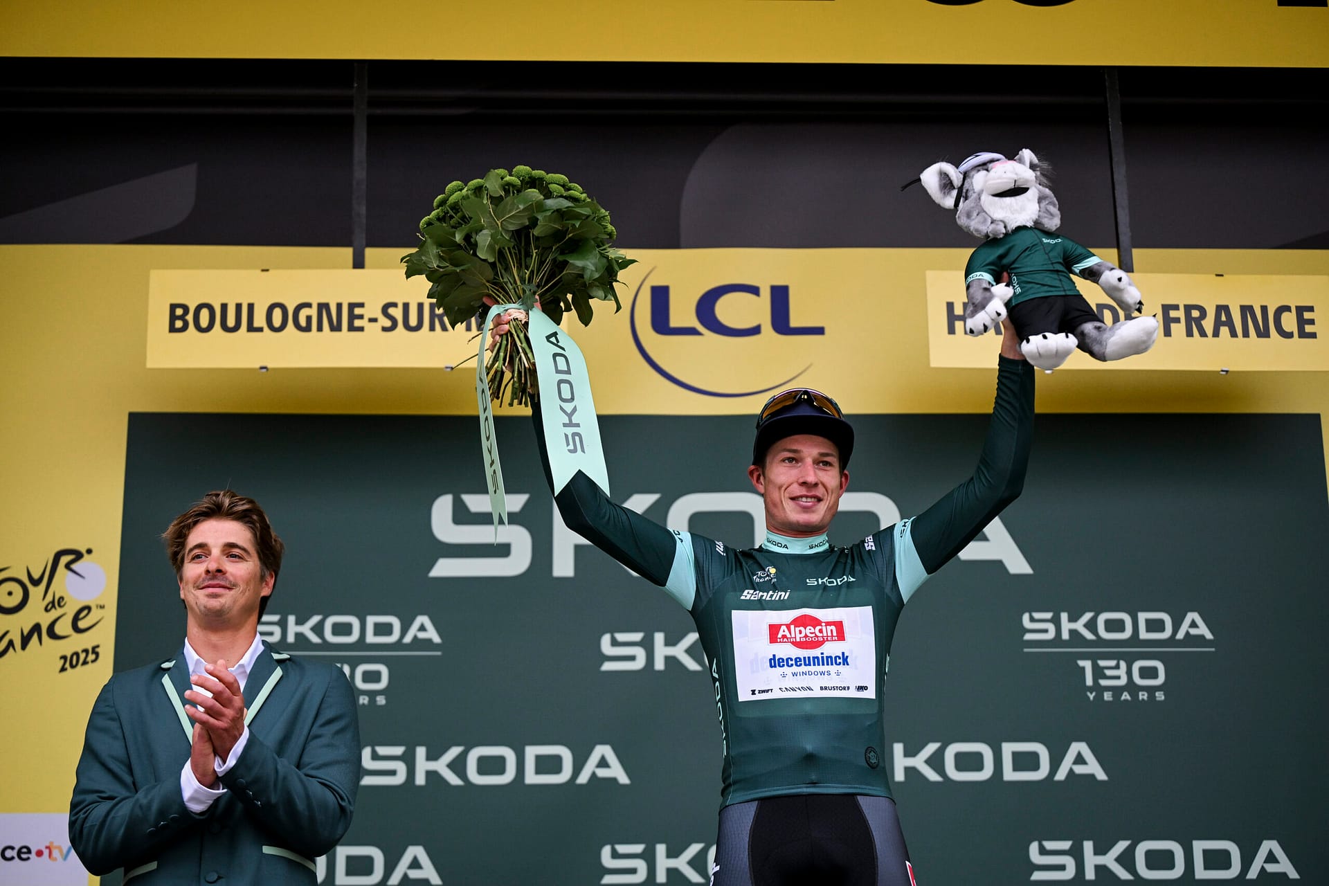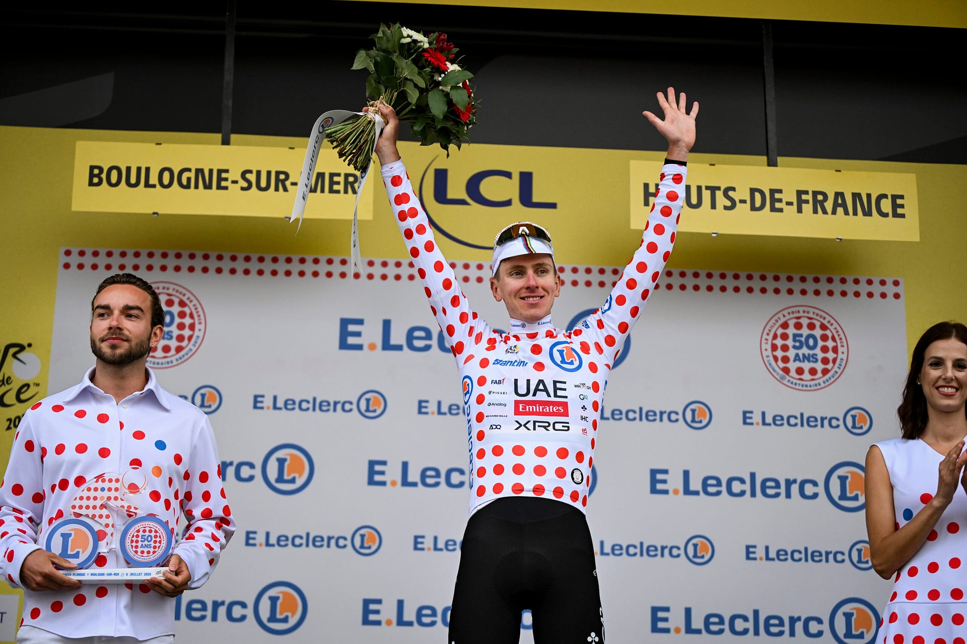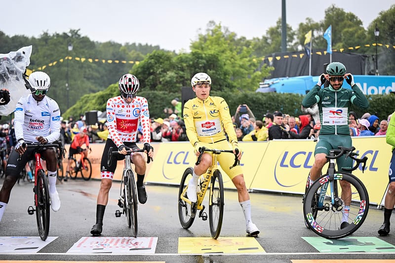 Uiteindelijk veranderden drie van de vier truien van rechtmatige eigenaar. Want het geel ging van Philipsen naar Van der Poel, het groen bleef bij Philipsen (dus hij zal dat morgen ook dragen) en Pogacar begon zijn veelvraterij door de bollen te pakken. Talent Kevin Vauqelin pakte zijn eerste witte trui. Een mooi stel renners bij elkaar.