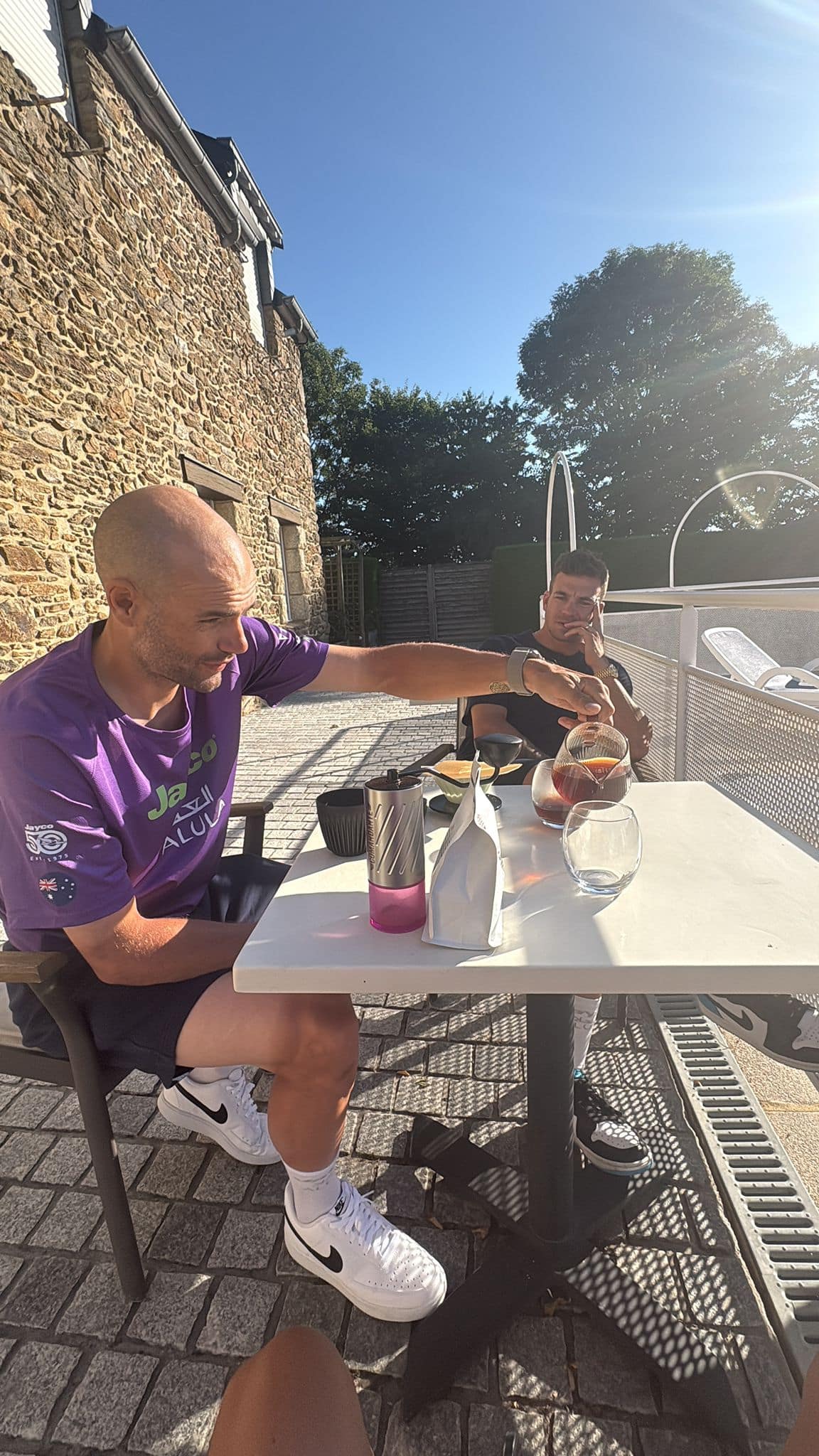 Voor hem hoeft die rustdag eigenlijk niet. ‘Van mij mag het wel doorgaan. Je zit in een ritme en een dag later moet je toch weer op scherp staan.’ Dus ligt hij op bed, kijkt tv, laat zich masseren. ‘En losrijden en even koffie met de ploeg op een terras. Ontspanning zit ‘m vaak in de dingen die op koersdagen niet kunnen.’