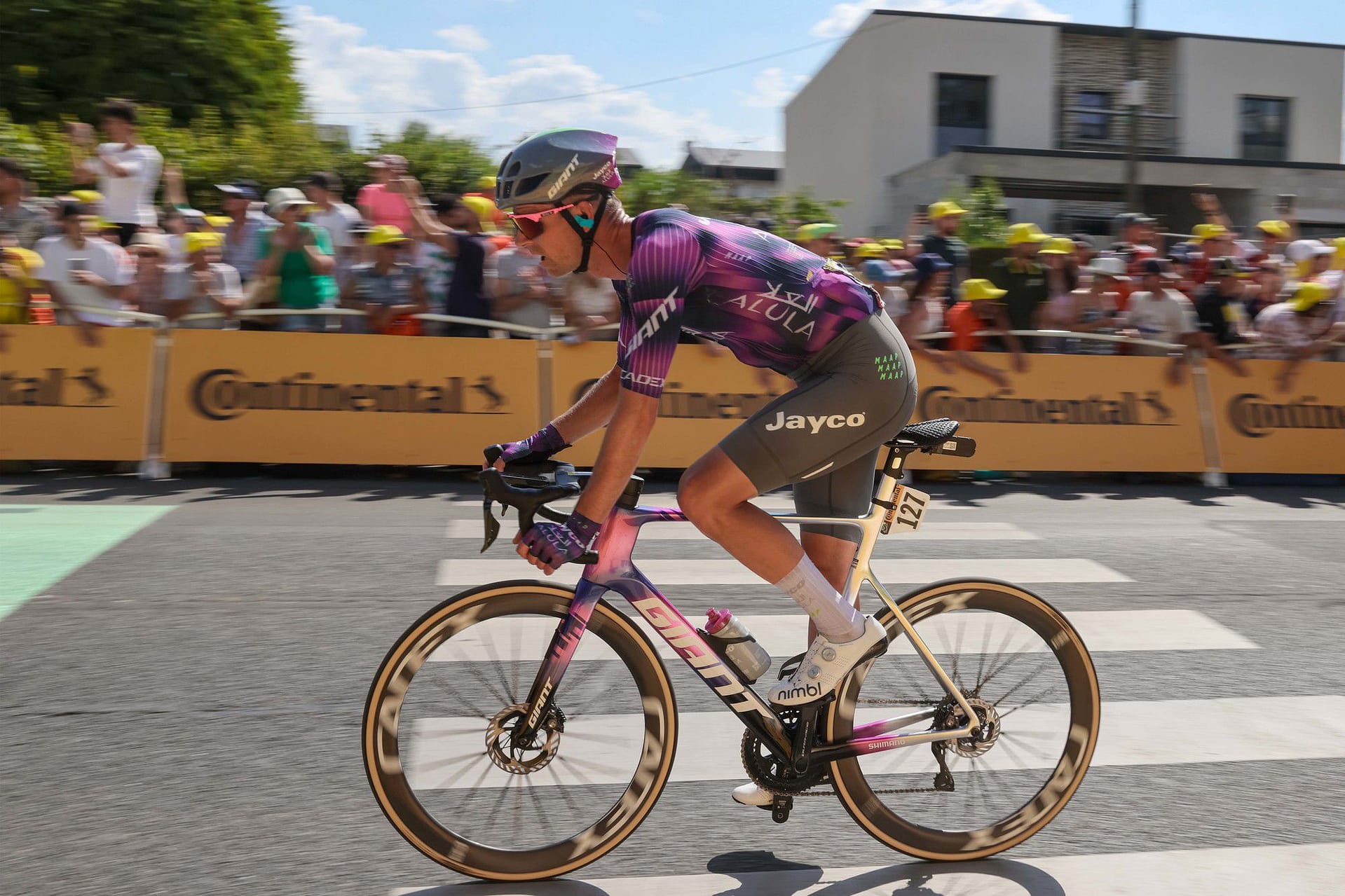 Morgen rijden ze nog één etappe voor het rustdag is. 14 juli: Frankrijk in feeststemming, witte jurken, rode wijn, getoeter. En Elmar in dienst van de ploeg. ‘We hebben een paar jongens die morgen wat kunnen,’ zegt hij. ‘O’Connor, Mauro Schmidt, Luke Plapp.’ Plapp werd eerder al negende in de tijdrit en had zelfs op meer gehoopt. ‘Te hard erin gevlogen. Alles of niks gespeeld.’ Als hij z’n Giro-benen bij zich heeft, kan hij zomaar eens een kanshebber zijn voor de rit.