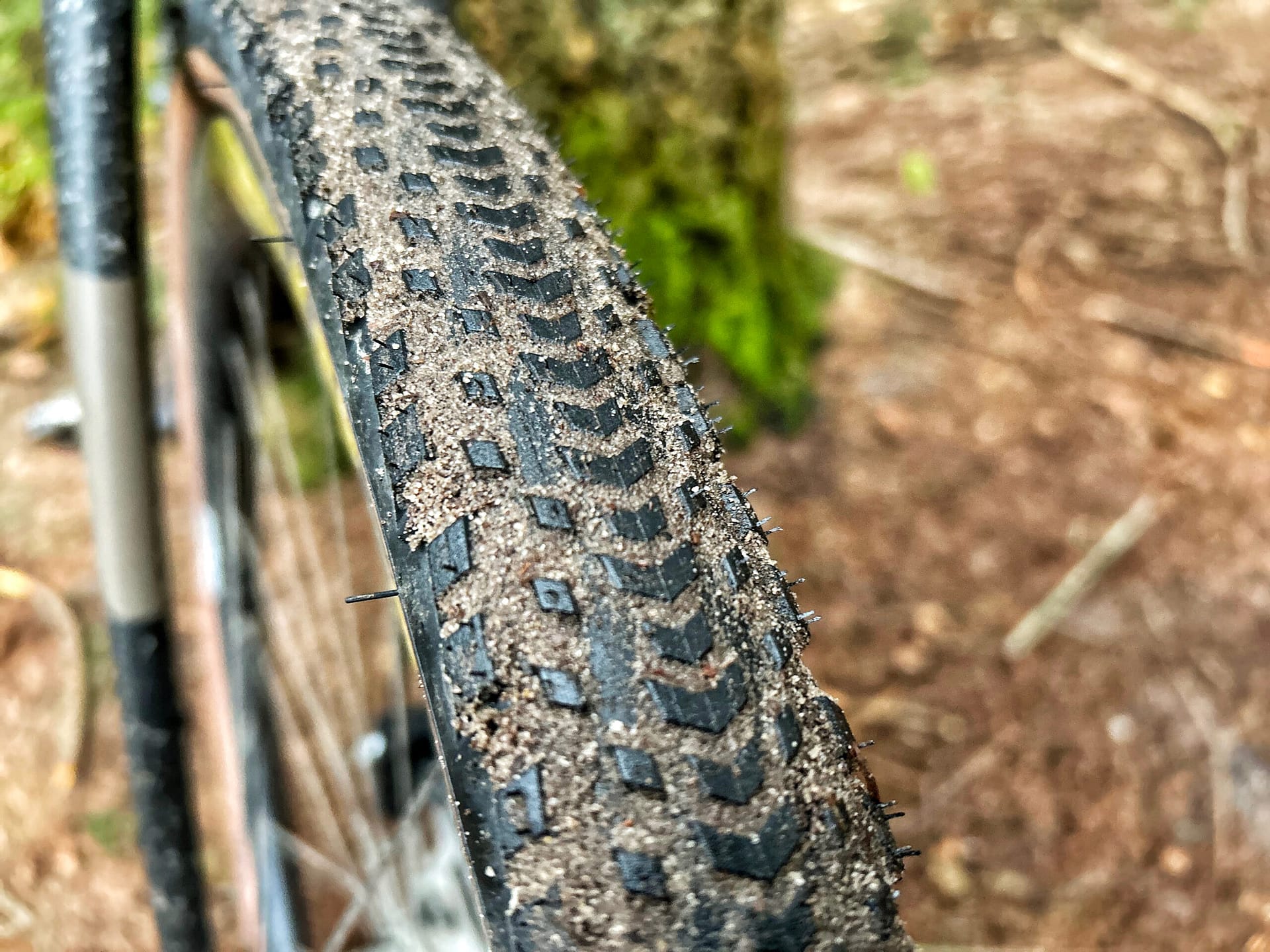 Met een minimale bandenspanning van 2,5 bar bij een gewicht van 65 kilo voel ik me zeker tijdens mijn ritten over wortelpaden. De 60TPI casing voorkomt dat ik de velg raak, zelfs op ruwere ondergronden. Het noppenpatroon zorgt ervoor dat er nauwelijks modder tussen de noppen blijft zitten, wat de grip bij natte omstandigheden ten goede komt. De grip in de bochten is uitstekend, wat me zelfs de mogelijkheid geeft om met de gravelbike op flowy MTB-parcoursen te rijden, zonder dat ik me zorgen hoef te maken over de controle.