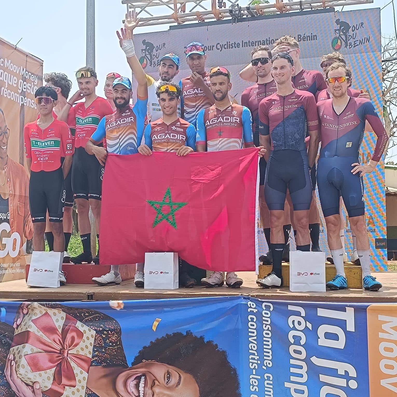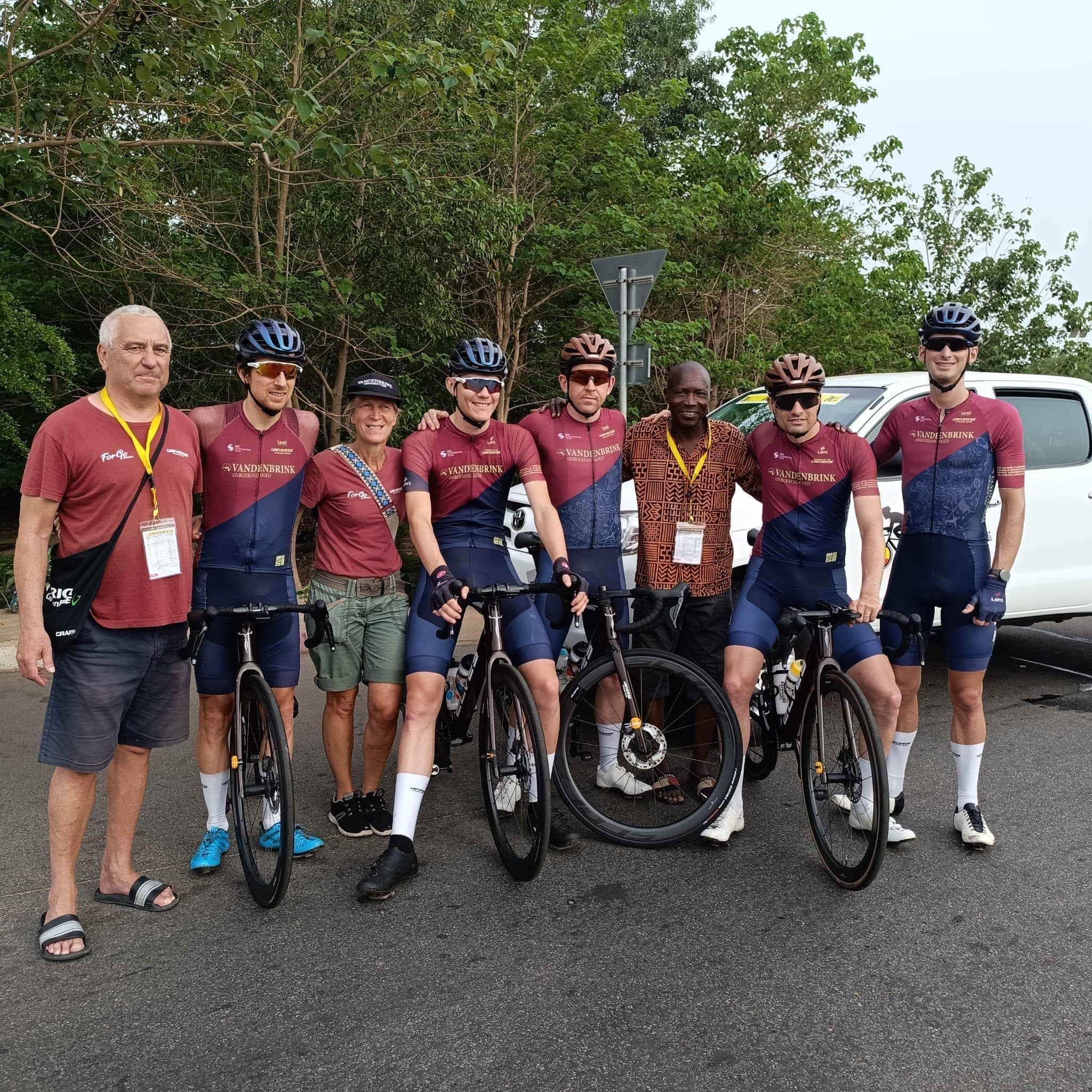 Dag drie in Benin en wederom een derde plek! Deze keer mochten we allemaal met Tom mee het podium op gezien het vandaag een “contre la montre par équipe” betrof. Over 25 kilometer, lastig geaccidenteerd parcours, veel wind, geen tijdrit materiaal, gewoon hard trappen met z’n vijven. We hebben het maximale eruit gehaald, zitten dichter op de winnaars dan we van tevoren dachten en klopten zelfs de Zuid-Afrikaanse brommers.