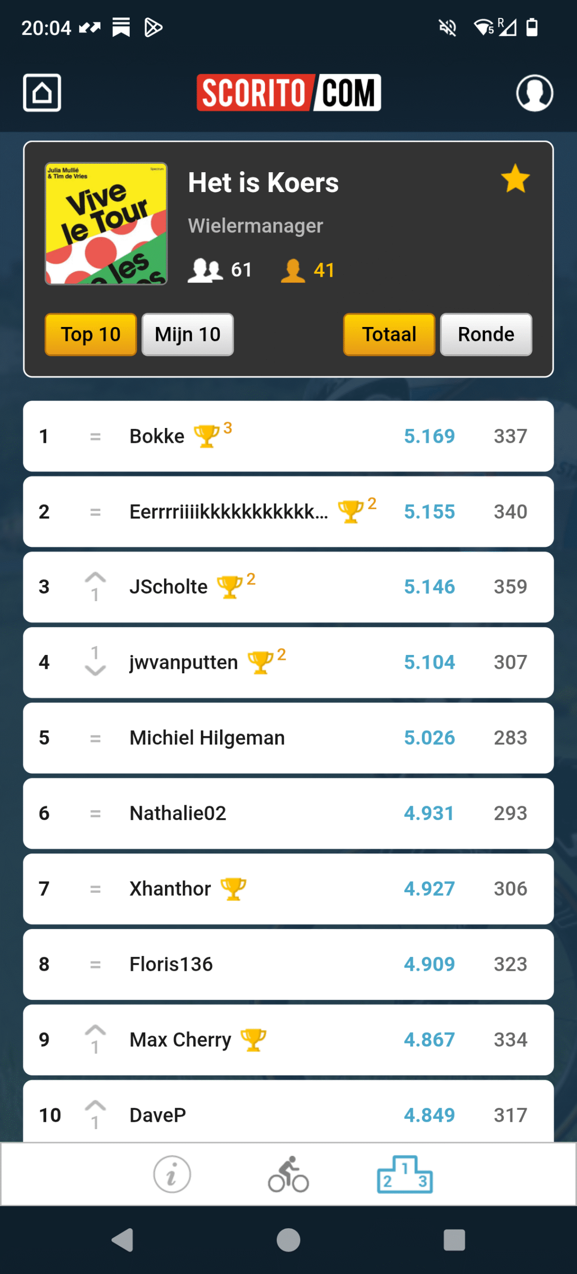Om de eindwinst blijft het vooralsnog ontzettend spannend. Gokken op de juiste vluchters kan morgen weleens de sleutel tot succes blijken te zijn. Wie heeft er na bijna drie weken nog de benen en motivatie om een uitvalspoging te doen? En in welke renners hebben Bokke en zijn achtervolgers Eerrrriiiikkkkkkk en J. Scholte vertrouwen? Het kan zomaar een dubbeltje op zijn kant worden.