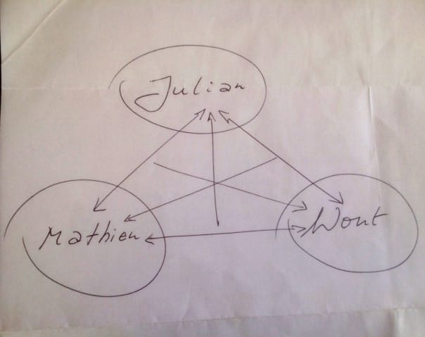 Voor een duo is het heel simpel. De een (zeg Mathieu) hoeft alleen de ander (zeg Wout) in de gaten te houden, en vice versa. Ik noem die speellijnen voor het gemak ‘krachtvelden’. Je krijgt als renners indicaties over de sterkte ervan, en je moet speculeren over hoe krachtig of belangrijk ze in werkelijkheid zullen zijn of worden. Bij een duo zijn het er dus 2. Wout houdt rekening met Mathieu, en andersom.