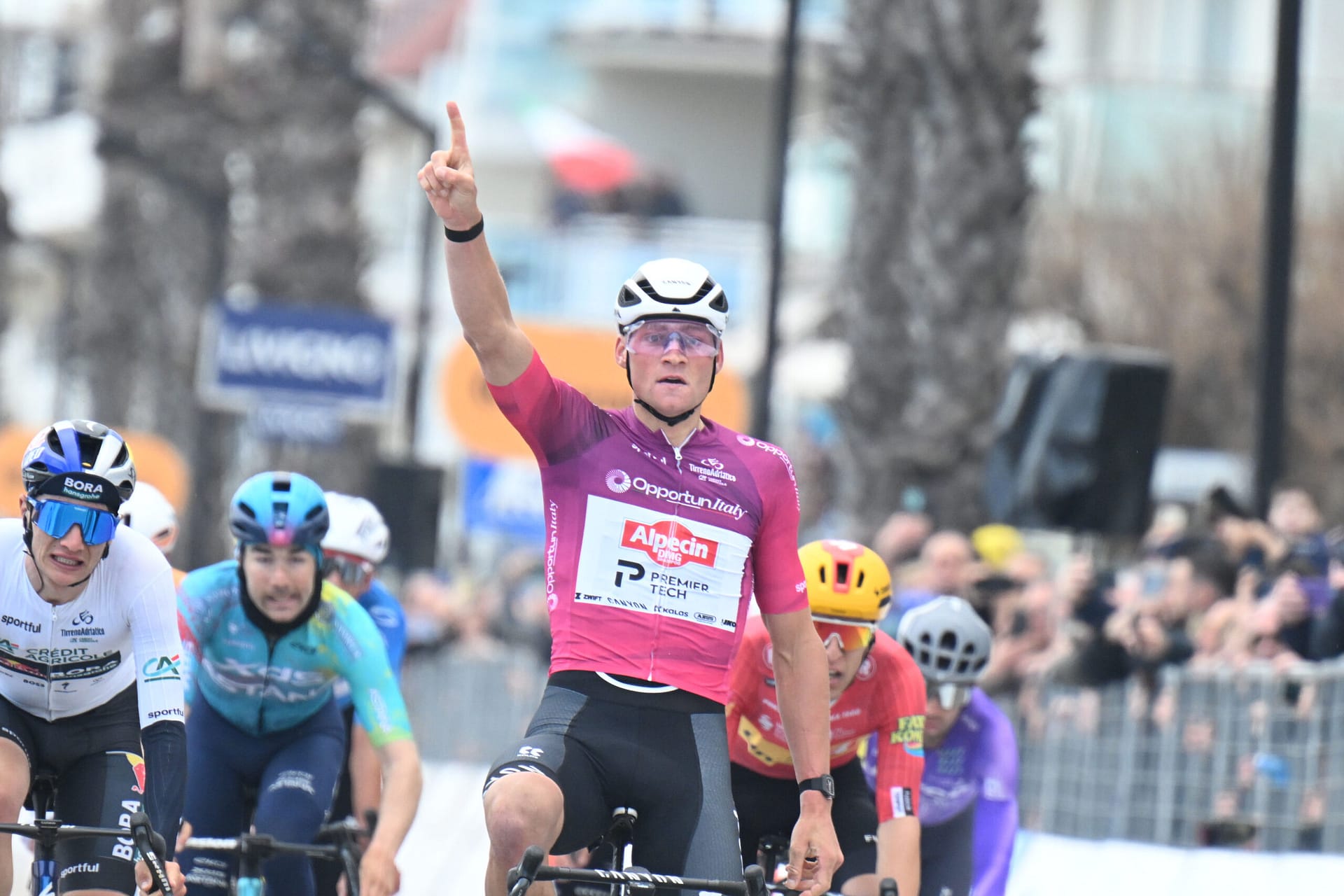 De renner van Alpecin-Premier Tech reed de hele finale in het spoor van Visma | Lease a Bike, dat met Matteo Jorgenson en Wout van Aert de koers vanaf de laatste klim naar Tortoreto (1,6 km aan 8,4%) op slot gooide. Die inspanning gooide een hoop kanshebbers overboord.