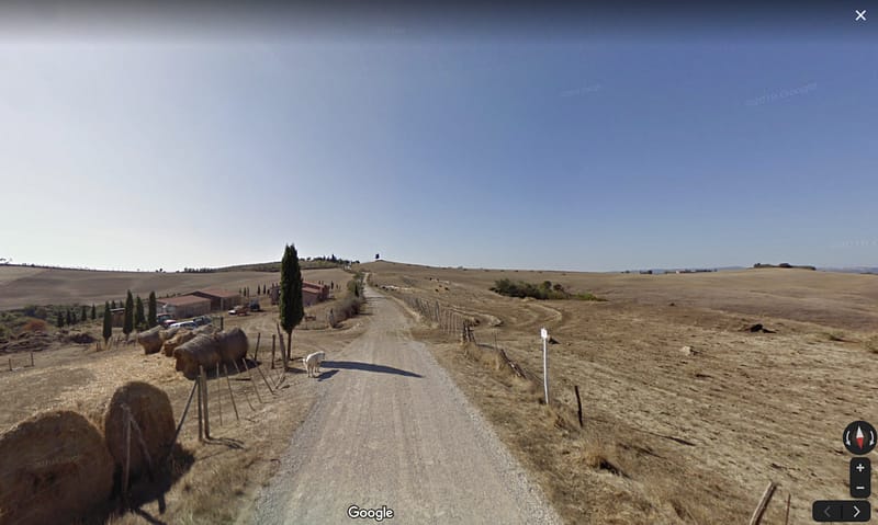 De befaamde strook is populair bij fotografen, omdat je vanaf de heuvel neerkijkt op de kronkelende gravelweg. Het is het einde van het langste gravelsegment van de Strade Bianche, meer dan tien kilometer lang. Alleen die boerderij staat op de foto’s in de weg. Een onooglijke en vieze keuterboerderij als je het via Google Maps dichterbij bekijkt. Een witte labrador loopt er rond die wegvalt tegen het witte gravel. Fotografen proberen terecht de boerderij links uit hun beeld te houden waardoor de eenzame boom aan de horizon centraal in beeld komt te staan.