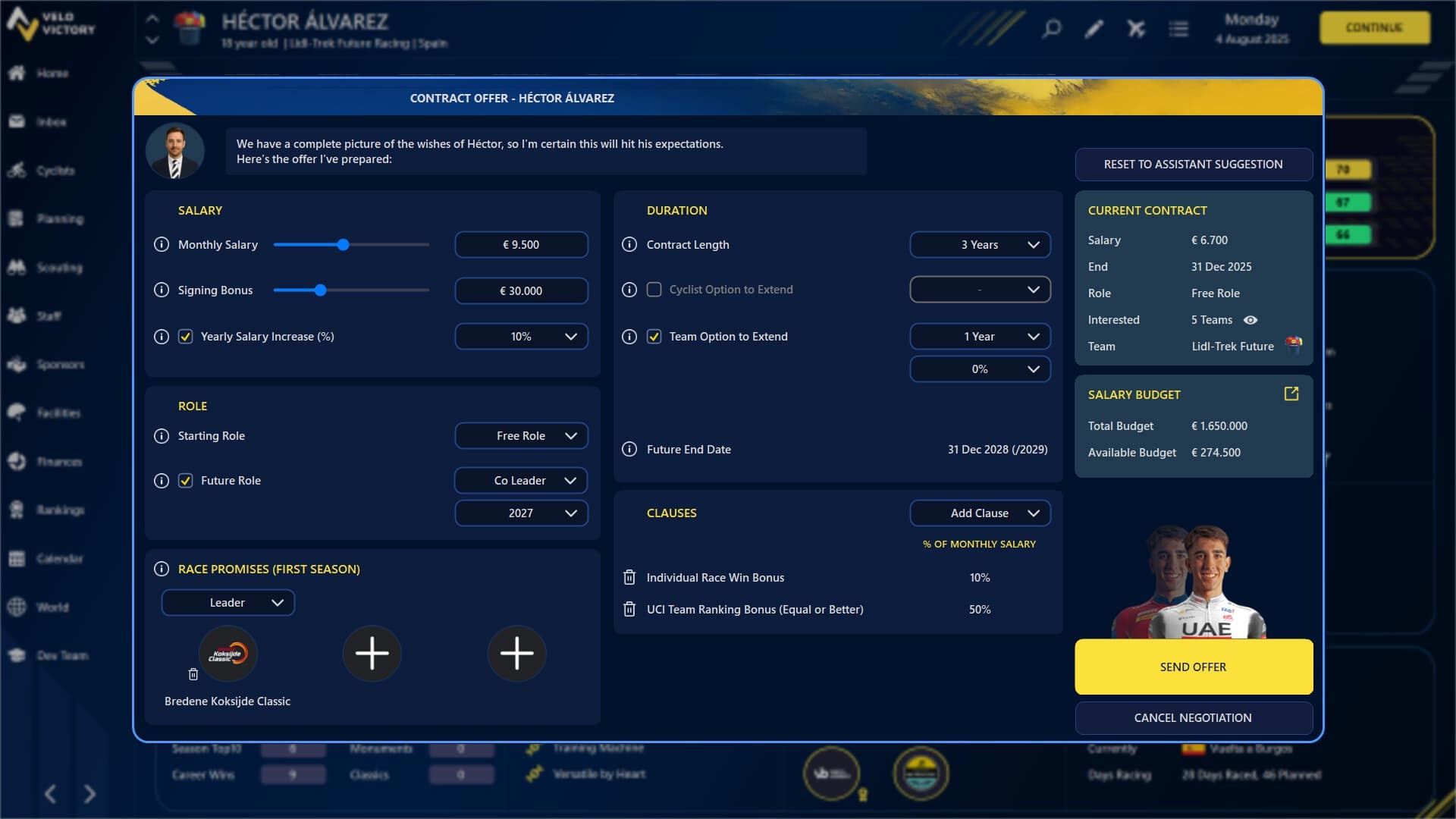 Stel dat een van je renners in volle contractbesprekingen zit, wat is het effect op zijn wedstrijden? Of misschien raakt een renner gedemotiveerd omdat hij niet de beloofde rol krijgt binnen het team. Sponsors kunnen plots met extra geld over de brug komen, of onverwachts afhaken.
