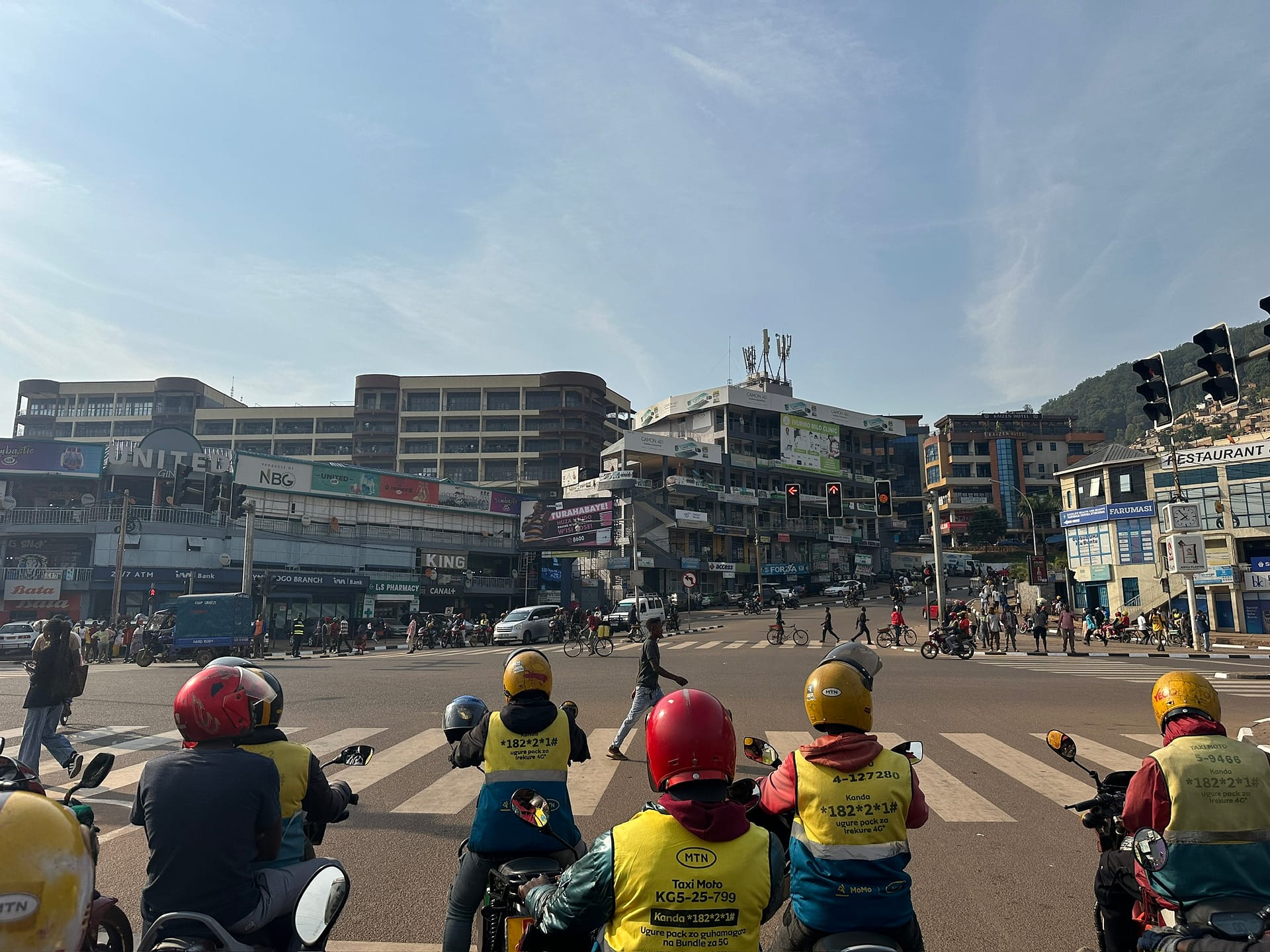 Foto Sander KolslootTerwijl wij de eerste keer naar de Mur de Kigali rijden, banen wij ons een weg tussen de brommertjes. De Moto Taxi is een geliefd vervoermiddel en voor ergens tussen de 1000 RWF en (voor de toeristen) 5000 RWF kom je overal in Kigali. Een groot deel is inmiddels elektrisch, maar de meerderheid zijn kleine smogproducerende racemonsters. We rijden vlak langs een busstation en daar is het dringen voor alle brommertjes, op zoek naar klanten voor een voglende rit. Wij staan netjes in de rij, te wachten op wat komen gaat.