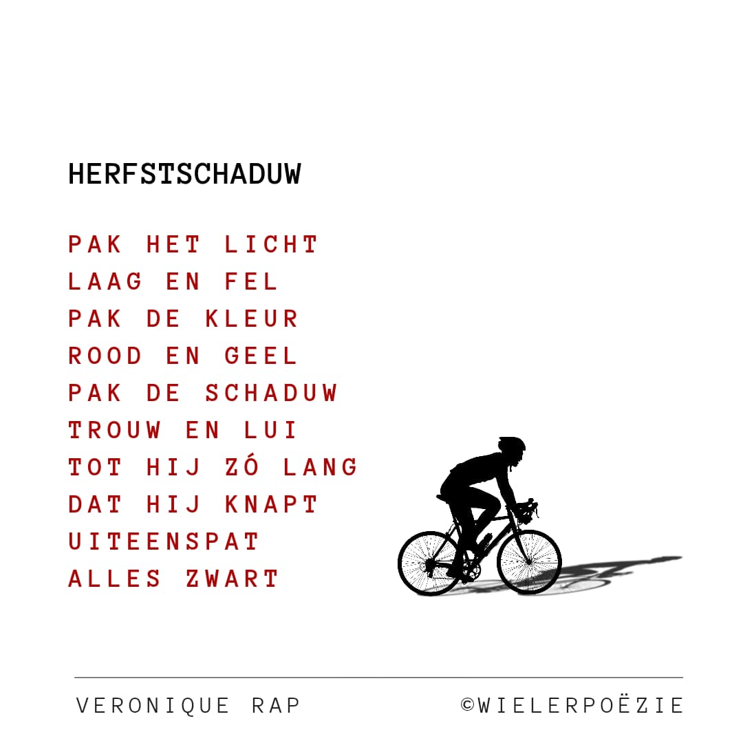 Hier op Het is Koers! mogen wij af en toe gedichten van Wielerpoëzie met jullie delen. Wielerpoëzie is een website van Bauke Vermaas en Veronique Rap. Op hun Instagram vind je gedichten over fiets(en) en wielrennen. Deze wielergedichten vormen zich op de fiets, gaan over fietsen, wielerwedstrijden, wielrenners; eigenlijk alles wat met wielrennen en fietsen te maken heeft. Vandaag bevinden we ons in herfstige sferen.