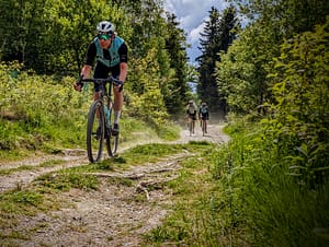 Eerst komen we langs een verlaten “dorpje”, heel vet om te zien. Het komt zo uit een WOII set. Om daarna door te rijden naar de TV toren, voor het contrast. De route gaat wel even terug, dus voor de puristen is het dikke pech. Maar het rondje is de moeite waard. Wat volgt is een aantal lange klimmen en afdalingen, maar ondertussen beginnen de kilometers en zeker de hoogtemeters wel te tellen! Na Willingen begint een sprookjesachtige trail langs een stroompje omhoog, dit is echt puur gravel genieten. Als laatste hoogtepunt zit er een verplicht stukje hike-a-bike in. Maar dit wil je niet missen, je loopt omlaag naar een serie van houten bruggetjes om via een aantal krappe haarspeldbochten weer te klimmen. Echt een beloning na een mooie maar zware dag op de fiets!