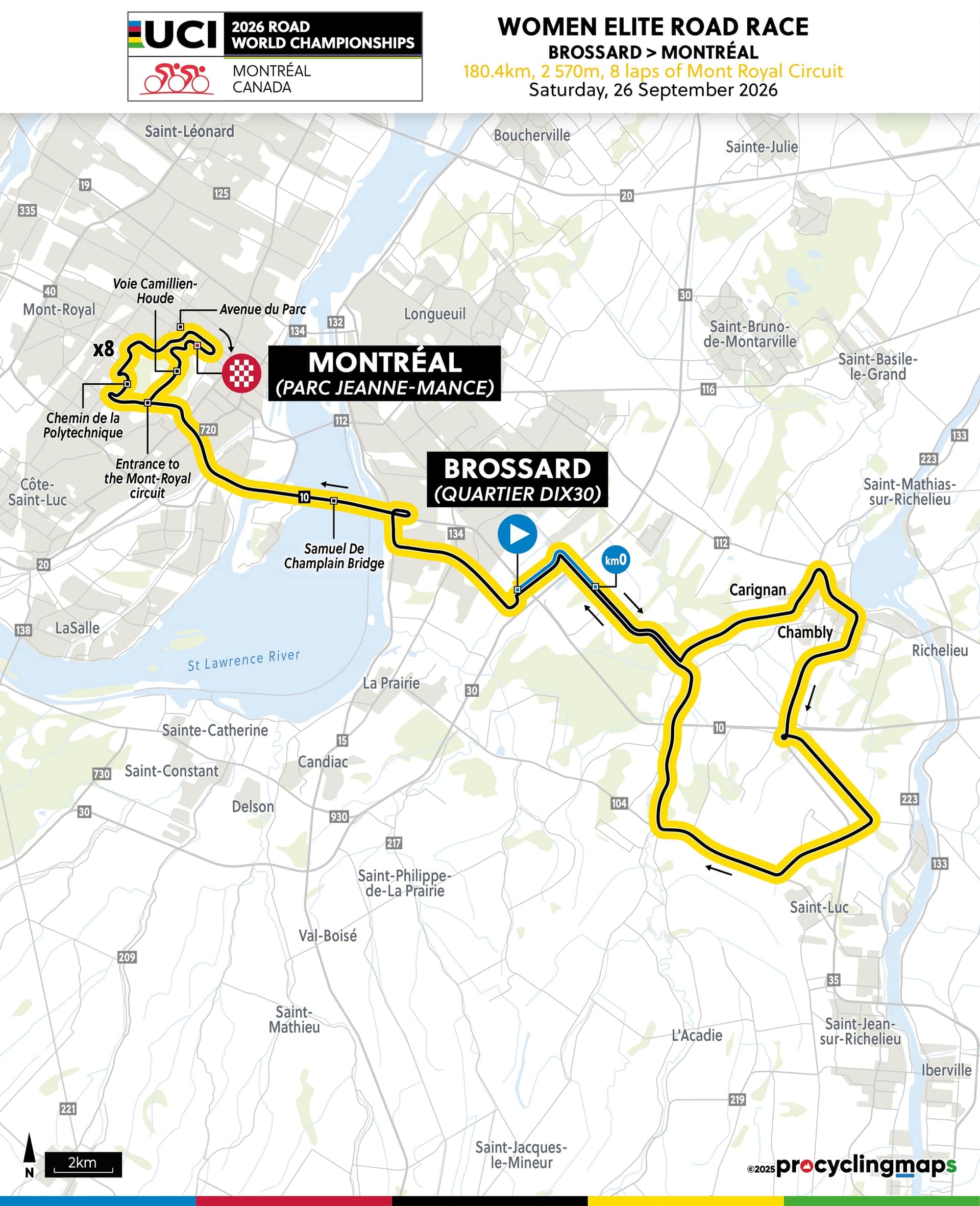 De UCI en het Organisatiecomité van Montréal 2026 presenteerden woensdag de officiële parcoursen voor het WK wielrennen op de weg, gepland van 20 tot en met 27 september. De wegwedstrijd voor elitemannen telt 273,7 kilometer en 3.803 hoogtemeters, verdeeld over een openingslus van 112,4 kilometer door de Montérégie-regio en twaalf ronden op het 13,4 kilometer lange circuit van Mont Royal. De elitevrouwen rijden 180,4 kilometer met 2.570 hoogtemeters en acht omlopen van hetzelfde circuit. Beide koersen starten in Brossard en finishen op de Avenue du Parc.